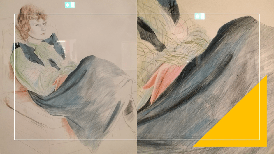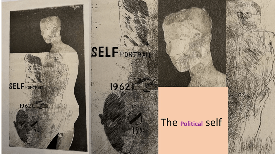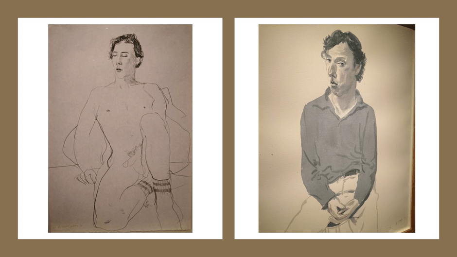 This figure, repressed by other prohibitions too in 1962 seems full of monstrous appetite for its teeth show grimly and lies in unnatural and unnuanced shadows, darker to the left or sinister side, which may be the result of disfiguring social representations, attitudes, norms and laws of a homophobic and heteronormative society. Inside the figure is yet another less ‘embodied’ figure outlined as a sketch and wearing a ’vest’, unlike the torso, or the way the body this sketched Hockney lives inside which uses hatching and shading to create the effect of body volume and density. Style then here indicates difference in different takes of Hockney’s self-image, or that of other queer people viewing the piece. 1962 was indeed bad year. I was eight at the time but the fear of being the queer man I knew I would become necessarily created shadows of the mind where desire and self bot seemed destined to develop under prohibition and misrepresentation. It was a harmful year: It was 1962. My own reading of this portrait is not helped by Howgate’s description of portraits with ‘questioning pose and sidelong glance’. Instead, all the poses in this portrait may question self under social external conditions that cannot be stated directly for they posit a desire and identity that must be occluded, but they only do by setting understandings between model, artist doing the drawing and the viewer that understand why these issues have become problematic at the level of representation. If there is ‘sidelong glance’ the sinister suggestion of that is a misrepresentation and / or violence that was performed daily on queer bodies or bodies under suspicion of being queer.