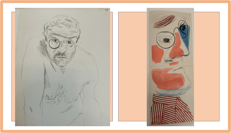 This isn’t always done without a positive and affirming side. In order to show this I want to look at Isabel Seligman’s view of that wonderful etching called Artist and Model, of which a detail is seen on the left in the collage below, in which Hockney appears sitting opposite Pablo Picasso, his painting hero. Seligman compares this with Picasso’s Two Catalan Drinkers of 1934 (on the right). Seeing homage to Picasso in Hockney’s methods, Seligman points our that both embody each sitter using entirely different means, drawing implements and styles. She says that Picasso contrasts an older man with a younger using on the left, like Rembrandt does in his aged figures, ‘a dense accumulation of hooks and curls for the wrinkled elder’ as opposed to the ‘spare and pared back line’ (elsewhere calling this ‘neoclassical purity of line’). In brief each is drawn to convey contrasting ideas of age and youth that feel almost insulting to an ‘elder’ like myself. Seligman shows that, though not using parallel techniques to this Picasso dyad, he does differentiate himself and Picasso by the style of their realisation as figures.