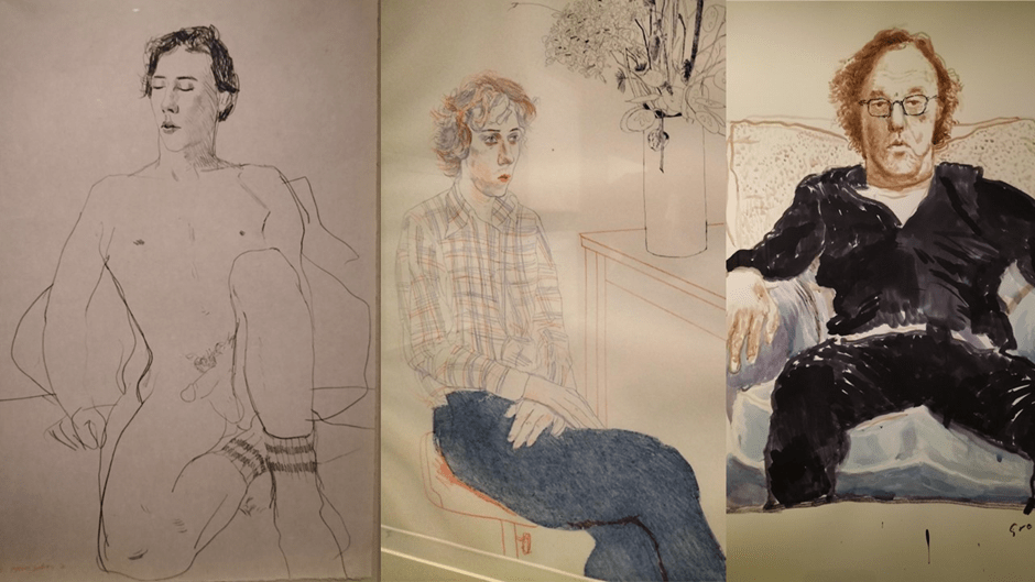 Gregory Evans however is featured for good reasons because in these drawings style is an obvious register of relationship as of changing appearance. I think Howgate is right to see this as illustrative of Hockney finding wisdom as artist, lover and friend in the philosophy of Heraclitus. In the artist’s formulation, Howgate cites the view that ‘Change is the only permanent thing we have’.[17] Hence we don’t expect linear progression in the representation of love and friendship as either a constancy or a linear decline or increase. Instead we find variation that demands the registration of a relationship in marks consistent with varying things: the artist’s development of use of materials and technologies, the artist and the model’s (often themselves artists) presentation in the world current to the work, the shifts in relationship between model and artist (a theme easy to take from Picasso). See the representations of Gregory below from 1976 (lithograph), 1974 (coloured soft-ground etching), and 2019 (ink on paper).