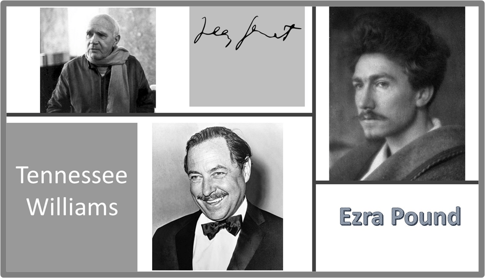 Genet by International Progress Organization – http://i-p-o.org/genet.htm, CC BY-SA 3.0, https://commons.wikimedia.org/w/index.php?curid=8499473, Williams at https://en.wikipedia.org/wiki/File:Tennessee_Williams_NYWTS.jpg , Pound by Alvin Langdon Coburn (1882–1966) – Lustra; also at http://www.rbkc.gov.uk/vmgallery/general/blue_plaques/large/vm_bp_0049.jpg, Public Domain, https://en.wikipedia.org/w/index.php?curid=65793014