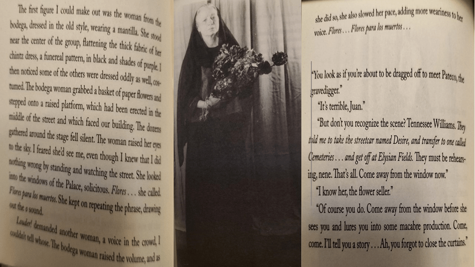 I think we need to look at this more closely to understand the skill it shows unearthing queer networks from history, that may not appear to be queer history. First, the text refers to the only line of the Mexican Woman (from Scene IX of the play: Flora para los Muertos, flores – flores …(Flowers for the Dead)’.[6] But after we see the picture of Edna in the book and it is clear in the text that Nene does not recognise the quotation, Juan identifies it for him with another precisely cited excerpt from Scene I of the play where Blanche gets off the streetcar outside the Cemetery: telling the story of how in her journey she transferred from streetcars respectively named ‘Desire’ and ‘Cemeteries’.[7]  It should seem a strangely functional part of the play for Juan to remember but it tells nearly all of the hidden story of the play’s themes relating to hidden desire to death and madness, effectively the queer content of that play. When the Mexican woman sings her vendor’s lyric song, her one line, Blanche is remembering living in a house where ‘dying old women remembered their dead’ saying “Death … We didn’t dare even admit we had ever heard of it’. After the line Blanche says: ‘The opposite is desire’ and forthwith tells the story of how, to the horror of her Southern American neighbours, she serviced the ‘trained young soldiers’ who ‘had gone to town to get drunk’.