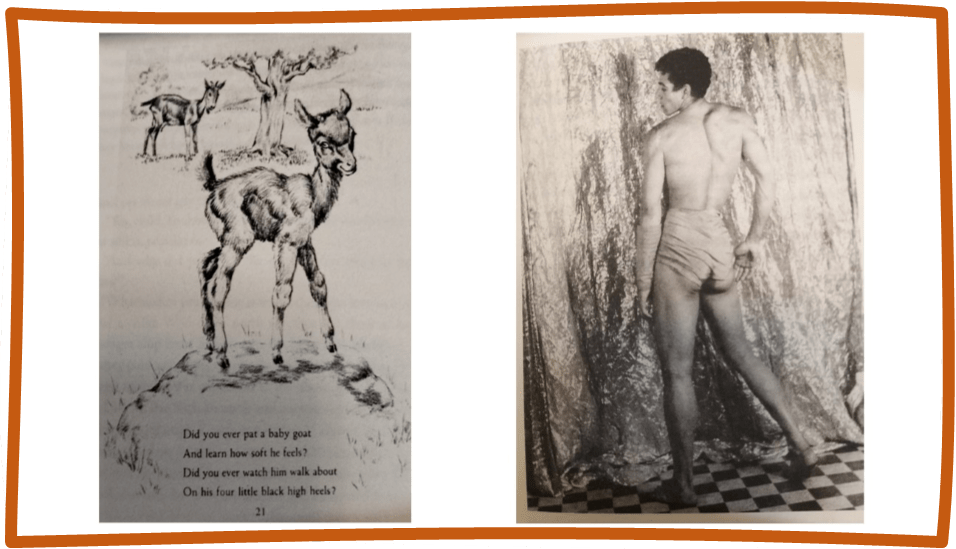 And Zhanye like Jan was a pioneer of a feminist deconstruction of sex/gender stereotypes and norms, which Blackouts celebrates, openly in the excepted illustration from one of Zhanye’s books that is described in the footnote supposedly written by Nene as one ‘of my favourite of Zhanye’s images, and perhaps another archetype: The soft little boy  prancing around in his mother’s heels? From her book Jingle Jangle’.[20] The idea of archetypes of queer behaviours prompts many of the beautiful original photographs from the supposed period of Juan’s life and his experience, such as the back view of one of the “eminent maricones” in it known about by Juan, who are actually people once really living. Maricones is the plural of a ‘profanity’ in Spanish used of a feminised man, ‘drag queen’ (and was used in this way rather oppressively by Lorca – himself described as eminent maricona in this book’s notes).[21] The photograph on the right of the collage below is androgynous from behind and in the chosen pose, though it is of Francisco Moncion (as photographed by the Harlem Renaissance of the 1930s by artist Carl Van Vechten). Of that image and other Van Vechten photographs Juan is said to say that they represent ‘one recourse’ queer people have ‘in despair’ in order ‘to remind ourselves there have been other worlds’. [22]