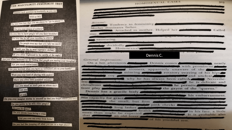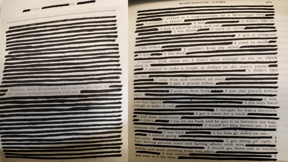 An, whilst, on that subject see the ERASURE POETRY on masculine and feminine characteristics in the book’s original terminology) ‘HOMOSEXUAL CASES’ from the supposed redacted copy I give excepts from on the right.[24] In the ‘Résumé’ of an unnamed ‘case’ absurd uses of feminine reference related to labelling by others (‘Called sissy’) or supposed characteristics of family power inversions (‘Mother  dominates father’) and medical labelling ‘decidedly’ / ‘. Homosexual’ might reasonably be characteristics of one person and their circumstances but have no causal relationship such as may be claimed under the blackout erasures. Similarly, in the case of Dennis C., the erasure add ‘perverse’ ambiguities and absurd pictures. What does ‘comes’ mean for instance and how can you imagine ‘prominent // trousers’? There is a beauty in words ripped from a supposedly scientific objectivity but made almost beautiful. Try this poem for instance: