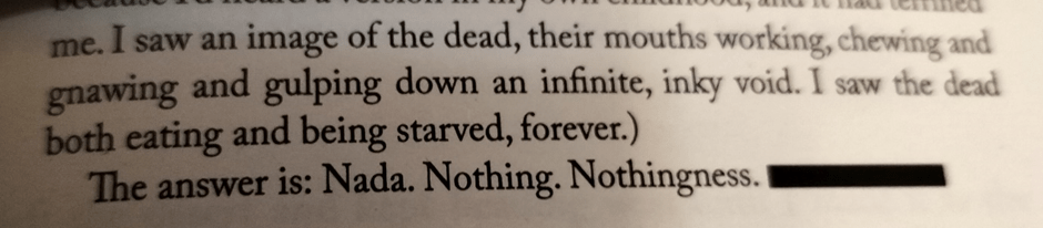 In this survey of a novel I love for so many reasons I can I think write forever of its wonders as a work, not least about paradigms of the human that it explores over and above the more obvious ones I refer to above: such as the contrast between ‘losers’ and ‘hoarders’, the ‘open’ and the ‘closed’, and the revealed and concealed, a paradigm that opens up new reading of the novel. There are almost certainly many more such. I will end though with the issue that intrigues me in this novel – for it is one in which food matters: eating it and being fed it by another. In a novel where there is poverty and destitution then this creates other identities, like the migrant, that intersect with ones derived from class, education, race, ethnicity, culture, sexuality, sex/gender and sex/gender identity. Nene, early in the novel recounts a story that tells of him cooking ‘this large, nostalgic meal – all for myself’ that he then finds he has ‘no appetite’ for, which leads directly to one of his fugue states, each of  which he calls a ‘blackout’.  A blackout is in this piece an experience that is summed up thus between Juan and Nene: “Then nothing?”/ “Nothingness.”[29] This story conceals one of the major motifs of the novel, which comes to the head as Juan begins to die. When, at a late pont, Nene senses Juan ‘deathly still beside me’, a phrase runs through his head: “What is that the dead eat?’ that Juan had ‘asked him once, A riddle’.[30] There is a BLINKERED ENDNOTE to this that provides an elaboration and answer of its meaning, telling us that the riddle is actually collected from Puerto-Rican children’s folklore. The answer to the riddle involves a memory of a dream of Nene’s in which ‘the dead, their mouths working, chewing and gnawing and gulping down an infinite, inky void, I saw the dead both eating and being starved, forever.