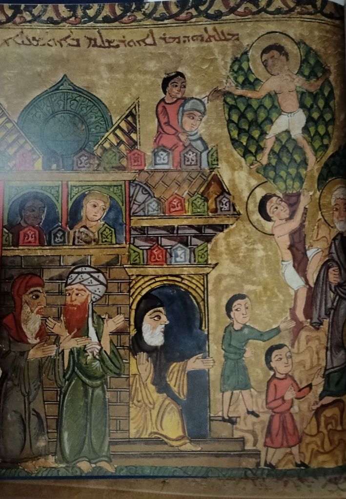 Though often thought to be a time of extreme conflict between the peoples who lay claim to know Jerusalem best, during which Crusade and Jihad are supposed as commonplace reasons for people to exert violence against other peoples, the book finds greater evidence of multicultural and multiracial reality, where mergence of cultures in its languages, texts and public architecture (notably the Fountain of the Inspector, about which it writes beautifully regarding its mixed architectural heritage. But that mergence often tolerated easy slippage between religious affiliations too, with evidence of ‘fluid religious identity’ amongst not only the laity but also some clergy and liturgies, at least between opposed sects like the Orthodox and Western Church. In one case, the mystic Ibn al-Arabi 1165–1240, says pithily that faith can be enjoyed across religious sites : “A cloister for a monk, a fane for idols, the tables of the Torah, the Qur’an. Love is the faith I hold’. Contemporary art (such as the illuminations in the Syrian Lectionary joyed in diversity: joyed in the depiction of multi-cultural and multi-faith and even cross-gender witness of Love. (2)