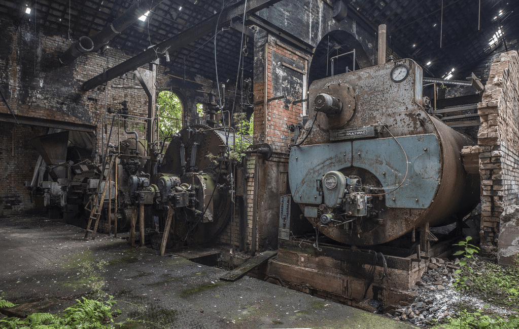 The picture prefacing this tale of two grandfathers shows Salterhebble Hill as seen from Siddal across the Calder Valley. In the base was the factory at Boys Lane my mother worked at and eventually Clem and wife, Aggie, of mining stock at Pontefract lived in a house at the bend of Salterbble Hill just behind the Falcon public house. I visited him at his work in the Sewage Treatment Works at the bottom of the hill, that you could smell all day in their home, as his fellow workers , as he called it, stirred it up. But my favourite trip was to the boiler house under the Hospital (I think under the Rotunda you see in the picture), the one at which I was born, down rickety steps: not a safe space for a child but things weren’t strict then. I remember the smell of oil and coal, the huge mouths of the boilers he fed and the hard muscular work. In the heat, like in the mines, men bared their torsos to the work. Now such places are ruins even in their mechanised forms.