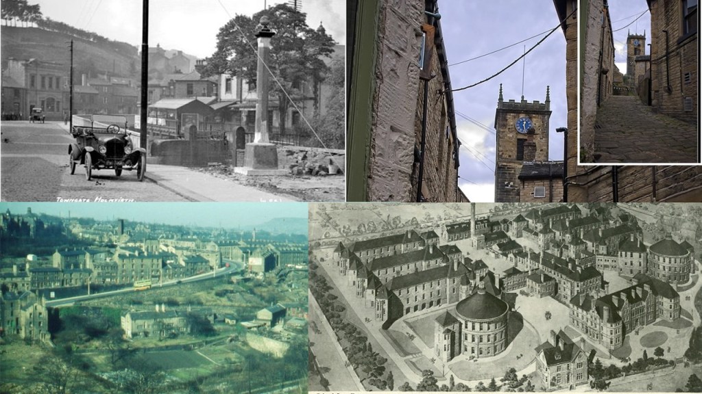 The places in the collage above were my grandparents’ environments and were in my mind equated with them. I would travel to them in the back of my dad’s work van together with paints, turps and folding ladders, for we lived then in Woodlands, an estate between Holmfirth and Honley or New Mill, depending on your route of travel. By my conscious childhood, my paternal grandparents Elsie and William (known to all as Billy, though he was an austere and unsmiling man) lived in a house just a little further on on the cobbled back street of Holmfirth shown in the inset picture in the collage top left. It was behind the stone steps that led to the stone church yard of the Church of which you see the tower in the picture wherein also was Beale’s fish-and-chip shop, that became the site of the cafe used in that dreadful comedy series The Last of The Summer Wine.