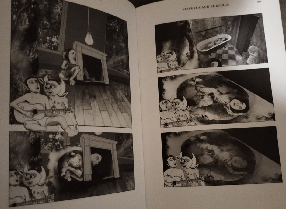 [3] Tom de Freston (2017: 86) Orpheus and Eurydice: A Graphic-Poetic Exploration London & New York, Bloomsbury Academic. The graphics are of the attempted drowning and attempted fading-away from the world of E / Karin while O / Tom sings to his demon-double, ibid: 88f..