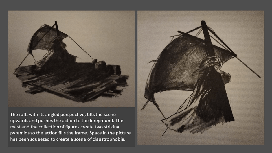 Empty the picture of its figures and what is left is a shallow stage. The wooden beams from which the raft is constructed build the illusion of depth in the painting and organise the composition across the flat picture plane. The raft, with its angled perspective, tilts the scene upwards and pushes the action to the foreground. The mast and the collection of figures create two striking pyramids so the action fills the frame. Space in the picture has been squeezed to create a scene of claustrophobia. The tensions and contradictions of a painting’s dual reality are amplified. Before we even make out the detail on the stage we are confronted by the architecture of intensity.[16]
