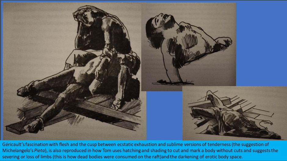 And Tom prefaces every section of his haunted story with its headings always evocative of how mental states can be visceral physical realities appropriate to a story in which male bodies decay and distort with inflicted external and internal damage (‘Rupture, ‘Wrestling’, ‘Flesh’, ’Flaying’, ‘wreckage’ for instance) and disease. Moreover on the raft bodies also get butchered and eaten by other men, still fresh limbs severed as required for the eating. It is a similar process to the act of analysis of the whole painting by Tom’’s drawings which reduce the painting to its parts (bodies and other matter) and understandings of them important for each section. For instance, early pictures show elements of the raft itself empty of figures.