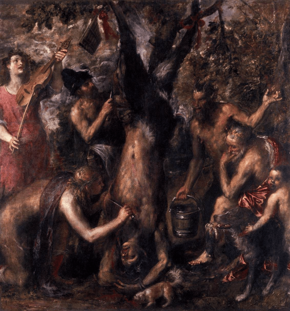 The deepest explorations are those that get under the skin in all those topics – in the sections that deal with flesh, flaying of the skin and cutting. Even whilst telling us that layers of oil paint are NOT flesh, Tom’s metaphors make them into such. Marks on canvas and on top of other paint or scrapings off (all acts well known to Titian and markedly in The Flaying of Marsyas) are like cuts on flesh or even the severing of limbs or skin from musculature.[22]