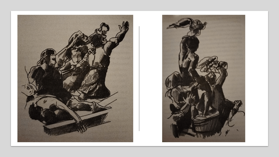 Both paint and pencil though can enact the aspiration of figures to greater clarity and direction of purpose as in the group in the drawing in the collage below on our left. To be behind in action in this drawing is to be washed out in heavy shading of pencil, and this is what Tom wants to teach us about Géricault’s subtlety. Sometimes shading is so darkened we may think we see a face emerging out of it where none is intended, which is Tom’s reason for the drawing below on the right (beautifully described in the chapter ‘Emergence’.