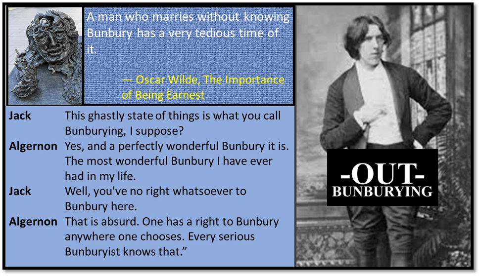 Oscar Wilde in the later nineteenth century explored play most not in his prose novels or even poetry, to which he dedicated his earnest, if pagan, soul, but in comic plays – where every meaning of what play means is active. And most celebrated, as I have suggested above, is that play, of which the title is too little studied in its own right: The Importance of Being Earnest, The whole story hinges on a man named Jack, who needs, if he is to marry well, to be called Earnest. But ‘being Earnest’ is not just about a name but also about the need for moral and pragmatic serious attention to an agenda that, in all real terms, must exclude play for its own sake, just as it does art for its own sake. Else why write a playful ‘play’ about the lengths it takes to play away from home – whether one is single or married – and invent for it a wonderful euphemism: ‘Bunburying’. Bunbury is an invented friend of the key comedic character, an aristocrat rather out of pocket somewhat called Algernon. Bunbury’s frequent sicknesses and need of care give Algernon an excuse to go and play in private in an unspecified ‘elsewhere’ called ‘in the country’. Jack disapproves of Bunbury and his function but he too lives a life that is a playful fiction that years to seriousness, earnestness. The yearning may have much to do with the wealth of the dowager Lady Bracknell, for it can hardly be attributable to the rather artless Gwendolen, whose rebellion against her mother is less than skin-deep, extending to the name ‘Earnest’ but not to an earnest grasp of her responsibilities or even her desires. We know Jack will need his own Bunburys when he marries, just as Wilde did, don’t we.