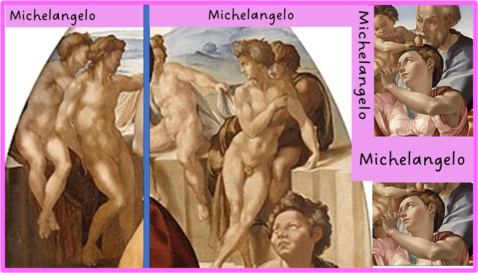 But I have looked at all this to concentrate on one picture by Michelangelo. It came to my attention again in a wonderful essay on Michelangelo I read by Eugene D. Glynn, the psychiatrist turned social-worker and husband, in effect, of Maurice Sendak. I owe to my dear friend, Charlene, knowledge of this book and I think I have more to say in later blogs of its wisdom and the relation of that wisdom to play in Maurice Sendak’s children’s’ books (I wrote about Sendak in an earlier blog at this link). Glynn writes in his brief Michelangelo essay (a review) about the Doni Tondo (a ‘Holy Family’) in the Uffizi Gallery. In his description he shows the layers the painting uses -a foregrounded Holy Family, John the Baptist slinking away to the right behind them, and yet further back’in the background, ‘five youths, very beautiful, very nude, very androgynous, again, engaged in mysterious action that seems to include homoerotic play’.