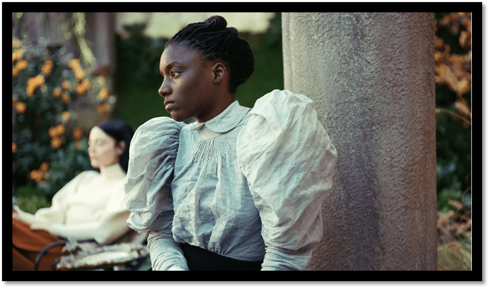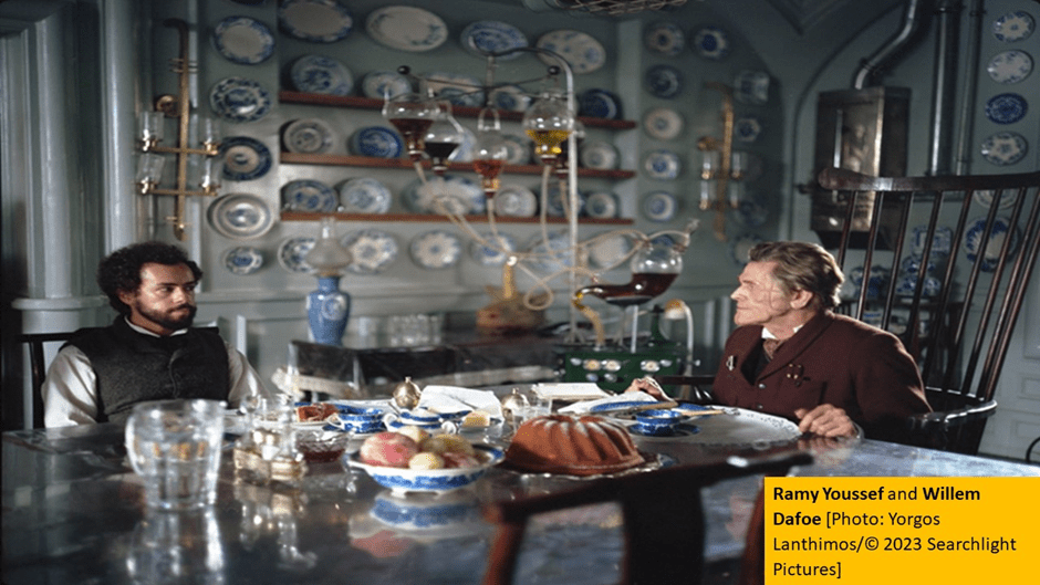 The film Poor Things ends with a complex ménage established within the home left to Bella by Godwin Bysshe Baxter, her maker, known to her as ‘God’. Ostensibly partnered formerly to Max McCandles (Ramy Youssef), she has incorporated into the household, as well as a group of animals formed by her own learned skills of vivisection – including the goat-brained former husband of the body she inhabits who otherwise aimlessly nibbles at the garden foliage (Christopher Abbott as General Alfie Blessington) – her former colleague in the Paris brothel, Toinette (Suzy Bemba pictured above in the foreground), who is her lover and Socialist mentor. Nothing in this ménage can be expected to fit norms, although it dresses as if it might pass as so doing when its solely human animal members go on their separate ways to the workaday world outside in the fantastical London of the film’s creation. It is a queer resolution to a decidedly queer film that nevertheless appears to pass as a sustainable happy ending that changes the world not at all. The resolutions of the film’s queerness are ones achieved in the home and idyllic garden. ‘God’ is dead, but his spirit presides, with his work carried on by his ‘daughter’, and all are gainfully employed and/or kept wonderfully and fashionably comfortable in the outer world and their own private one. In the care of female hands rather than the odd male couple God and Max, the second female corpse revivified by God (Felicity played by Margaret Qualley) is now blooming. The garden is a kind of private Eden, reserved from troubling norms but, on the other hand not allowed to trouble those norms outside that private space too overtly. Altogether delightful – no loose ends trouble one either as one leaves the cinema or re-examines the film in reflection.