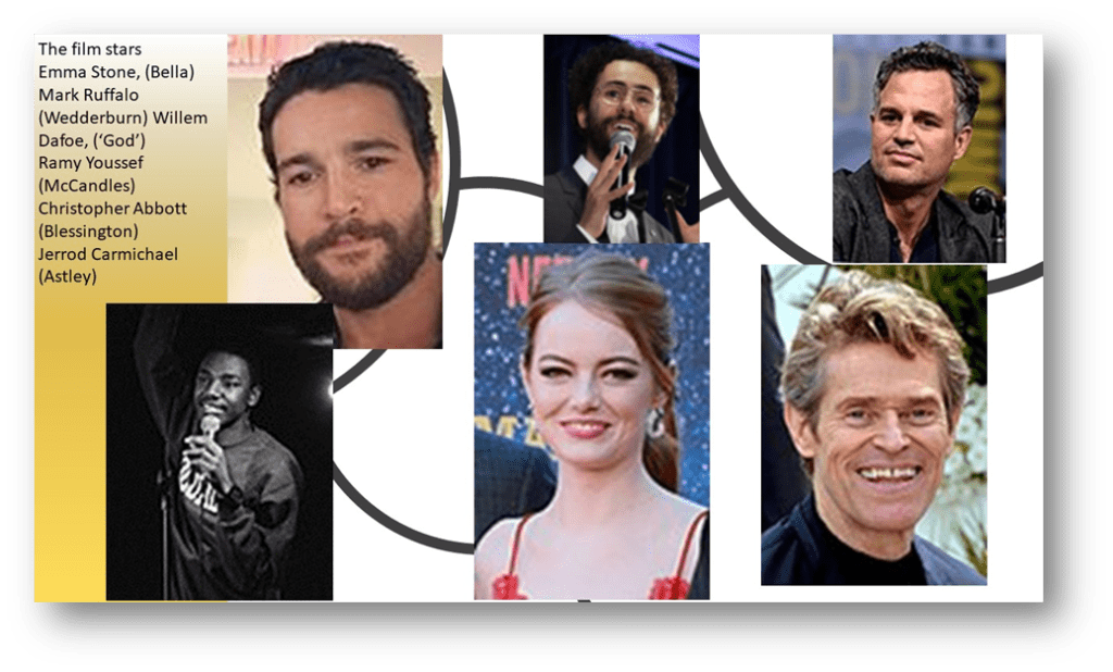 Most of all it relates to the novel’s querying of the basic binary of truth and lie – or fact and fiction – (and I will have much more to say about this in my third blog), for all stories, let alone novels, often live on the cusp of that binary, where queer things are things that break the framework of accepted truth norms. In the novel, this is especially the case in classic Scottish novelists who wear it on their sleeve in a rash of ‘confessional’ novels and a bevy of unreliable narrators, for which we can witness novels known to influence Gray like Hogg’s The Private Memoirs and Confessions of a Justified Sinner and Robert Louis Stevenson‘s 1886 novella The Strange Case of Dr Jekyll and Mr Hyde. And the tradition continues in novelists very much influenced by Gray, for example James Robertson‘s 2006 in his novel The Testament of Gideon Mack and Graeme Macrae Burnet’s work. I have blogged in the past on both Robertson and Burnet (see link on their surnames in this sentence). More is to say on this in blog 3 of this series but here I want to show its pertinence to the issue of queer plots. The main narrative of the novel, the only one acknowledged in the film, is meant to be a privately published memoir by Archibald McCandless telling the story of his acquaintance with Godwin Baxter and the progress of his love for God’s creation through vivisection of Bella, though it purports also to witness Bella’s story in her own letters as translated by God, and in some cases reproductions of her own marks in account of herself. The layers of witnessing here are an invitation to both unreliable narration and, to put it bluntly, events so ‘queer’. Even when just out of the ordinary, that they may be lies.