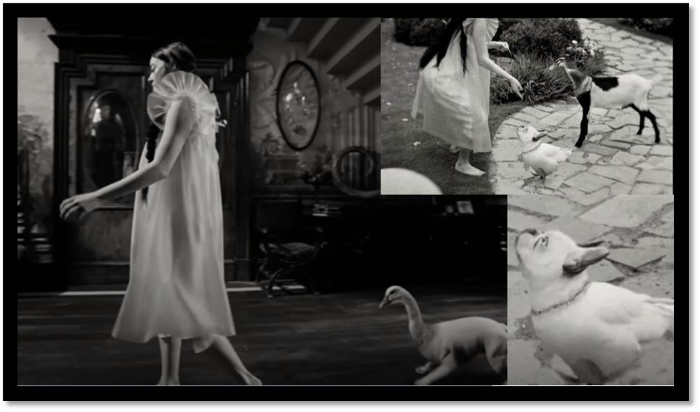 The role of Godwin as a monster is equally fraught in Lanthimos’ film, for that references in the mask of make-up given to William Dafoe to play ‘God’ a reference to the monster created by Frankenstein in the early films wherein Boris Karloff played that monster, based more though on facial structure and scarring than likeness. In the scene where, in the collage below, ‘God’ shows off his ‘monster’, roles can seem to be reversed, though Bella shows no fear of ‘God’ unlike the fear that Elsa Lanchester, herself a monster, has of her male peer in The Bride of Frankenstein.