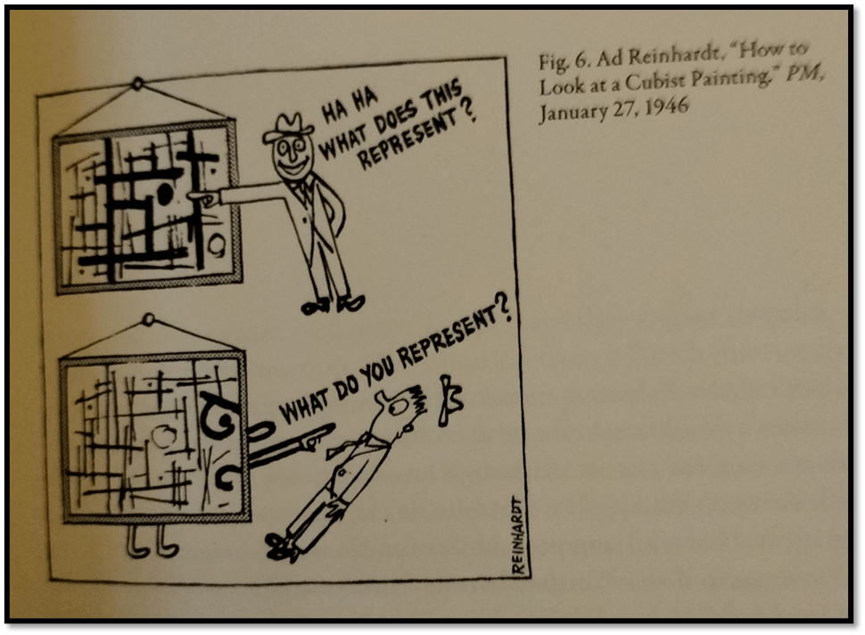 Nevertheless, as Jessica Bell Brown, suggests, there is aggression in her sitter’s gaze (the sitter was her partner and a queer performing artist, a musician, Mackenzie) at the viewer and embodies it her title: What Am I Doing Here? I Should Ask You the Same. Those sentences might be thought to be spoken by the art’s subject (Gribbon’s partner Mackenzie) or the artist themselves and addressed to different audiences. These could be the painting this artist is paired with, Hans Holbein the Younger’s Thomas Cromwell (1532-3), the curators at the Frick, or the Frick’s usual visitors who come into it in order to see ‘classic’ art in the most cases.[6] Gribbon speaks of a childhood to which any art gallery was alien, which even now, on the Frick’s invitation, stimulated an ‘imposter syndrome’. But despite that self-belittling response, at which august institutions are so good at creating – though they are always genuinely (or disingenuously) surprised to hear of them, Gribbon also clearly has some rage that resembles the painting’s version of that in the Ab Reinhardt cartoon: ‘A lot of questions I wanted to pose came from my feelings about being included in this space’. The content of these feelings is, I think of importance to queer art.