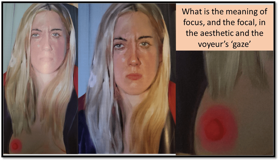As Jessica Bell Brown notes the focus of the feelings may relate to the tension in the painting’s attraction to the gaze, including a gendered gaze. Our gaze may be drawn to the stern face haloed by the dark of a shadow proceeding from unforgiving frontal lighting, or the centrality of the ‘masculinised’ posture of open legs, adorned by rich, almost queenly jewelled hands. But there is no doubt that the strongly coloured nipple, which is enhanced by other colouring contrasts, and which the curator’s call ‘one of Gribbon’s signature neon-pink nipples’.[7] But surely there is more to it being a ‘signature’ than Gribbon alerting us to her presence. We are inclined in art-history to apply that rather old-fashioned tool of invoking the ‘male gaze’ to indicate how a painting distributes focal attractions to the eye, in the service (so the limp theory goes) only of the male gaze instituted by patriarchy, and which subjects female sexuality to male control. However, this nipple is part of the artist’s own engagement, as a queer women with her living and sexual partner. To call it called forth by the male gaze is a major category error, for it is so when we assume paintings directed primarily at men. These readings are present too, but in tension with the painting’s superb and unapologetic queerness (the deliberate plain setting is the home of Gribbon and Mackenzie).