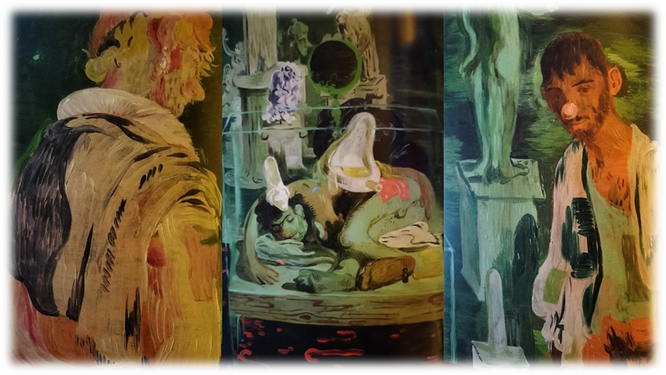 The central detail in my collage is that stuffed vitrine, containing objects of mixed association. Though the urinal must recall Duchamp’s early modernist sculpture named ironically Fountain (for both are represented upside down) as we are told in the commentary, it is queered by being full of realistically represented urine, dripping on the queer male subjects from above. There is a ballet slipper, and other objects that play on stereotypes historically used to marginalise queer sexuality as either effete or disgusting. Are we therefore asked to acknowledge her in this ‘fag puddle’ turned artwork by its framing, the fact that queer lives have always been framed historically for a gaze that is not only asked NOT to identify with queerness, but to see such identification as of the marginal and not due the viewer’s regard or respectable. The composition of the queer bodies in it is even aimed at this end. The pale brown figure has his head thrust in the space in which we think the pale green figure’s chest may be. Is this a sexual act – if it fellatio it is hard to configure how, oral nipple-play, or merely a consequence of two bodies having to be squeezed into one small vitrine.