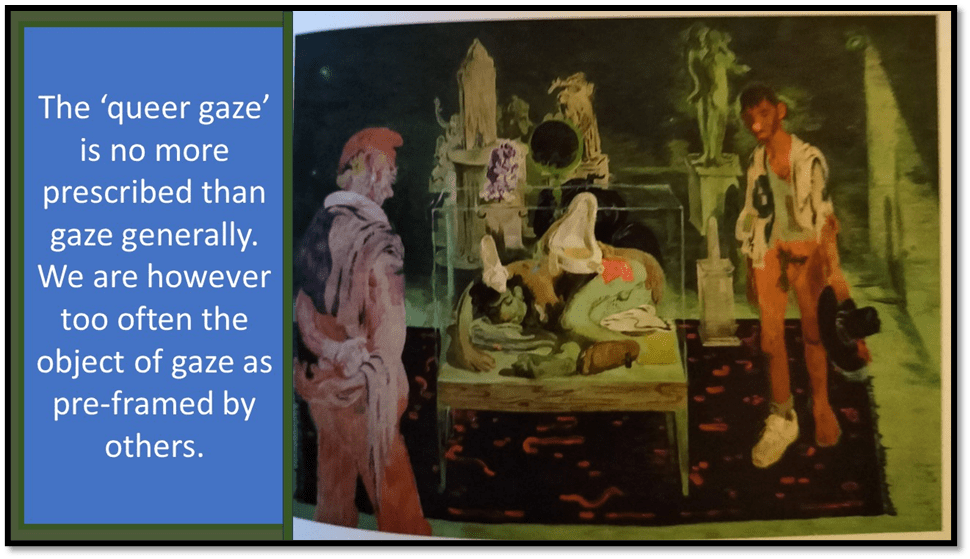 Yet though the sexual content of Toor’s painting is clearer than Vermeer’s, I think the purpose of mirroring it with the Officer and Laughing Girl (ca 1657) is precisely to utilise art-historical speculation that this is a liaison between a gentleman and serving-class prostitute.[10] Axiomatically at least therefore I read Toor’s position on being displayed as he is surrounded by Old Masters and their lovers (who certainly feel themselves superior) thus in my own words in the collage above: ‘The ‘queer gaze’ is no more prescribed than gaze generally. We are however too often the object of gaze as pre-framed by others’. If I unpacked that axiom, it would say that the playful or lewd possibilities of two people gazing at each are the same for an ‘Old Master’ as a ‘Queer View’. The difference is that queer views are still offered as ‘framed’ and interpreted by both heteronormative and homophobic perspectives, which cause them to look either ‘strange/other’ or, worse, disgusting. For me, this is a wondrous painting (there I said it again).