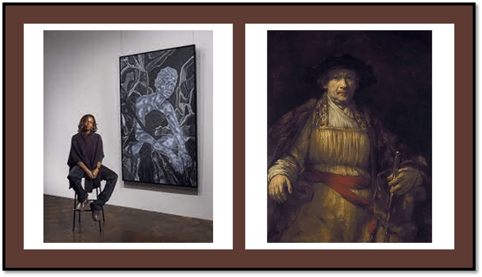 It is not only that last sentence is grinding in its lack of sensitivity, since the condition of queer persons has too long been that of obeying the demands of institutions except in private. Hence this phrasing hurts (me at least!). it fails to see that queerness has ALWAYS been constructed as something to been look at by others with greater power and authority in matters of sexual conduct and /or representation. These others are those who do not identify with us but who may like to be connoisseurs of our oddness, in dead as well as live specimens, as adornments of their own heteronormative moral ontology. Too often that control is prohibitory and creates false and disgusting or laughable stereotypes. Toor captures what it is like to be that oddness enclosed in noli me tangere glass in his vitrine as I have said. In many ways Ojih Odutola may deal best with this, for she invents a fiction to support her painting of The Listener of a mythical African tribe run by lesbians and served by subjected men. Of course so does Rembrandt have a self-improving myth for his 1658 Self-Portrait, but the fiction is, as the Catalogue of the exhibition says so brilliantly, a myth of monumentality and control that is contradicted entirely by Rembrandt’s wasted gaze at the viewer which is far from exerting power over that observer. The cataloguers say: ‘Rembrandt was bankrupt by the time he painted it. … His pride was fleeting,…’. [14]
