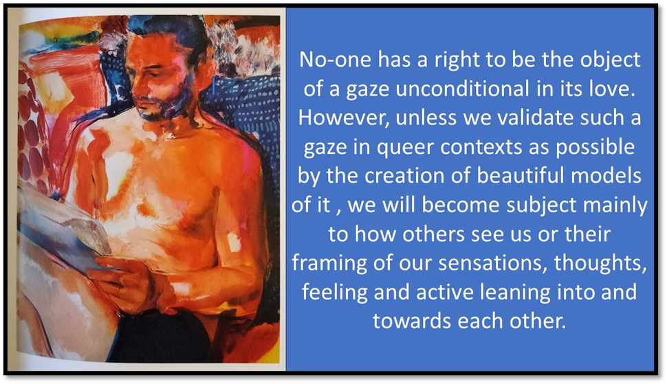 No-one has a right to be the object of a gaze unconditional in its love. However, unless we validate such a gaze in queer contexts as possible by the creation of beautiful models of it , we will become subject mainly to how others see us or their framing of our sensations, thoughts, feeling and active leaning into and towards each other.