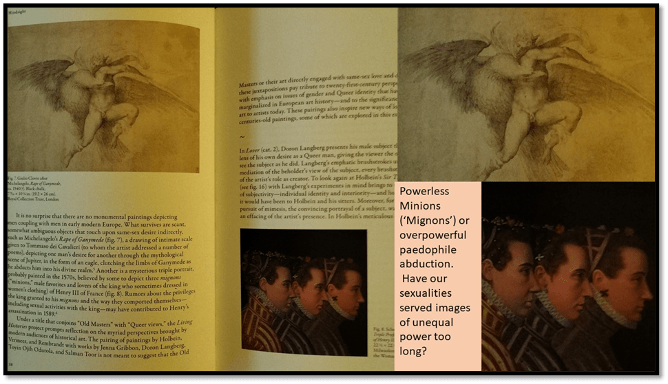 In conclusion, I should say that the book does have use for art history, though I felt I had to take this with a big pinch of salt. See for instance the reproduced fold that is pages 38-39 of the book below, from Aimee Ng’s essay ‘Hindsight’, It looks to examples of the failure of homonormative art, even by men often claimed to be exclusively queer such as Michelangelo, represented by his 1540(?) Rape of Ganymede or intended to institutional male queer practices in the courts of some medieval/Renaissance kings, Such as the Triple Profile Portrait (the Mignons of Henry III) of 1570.