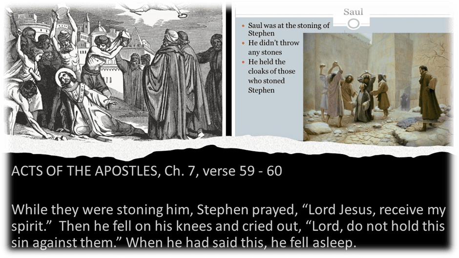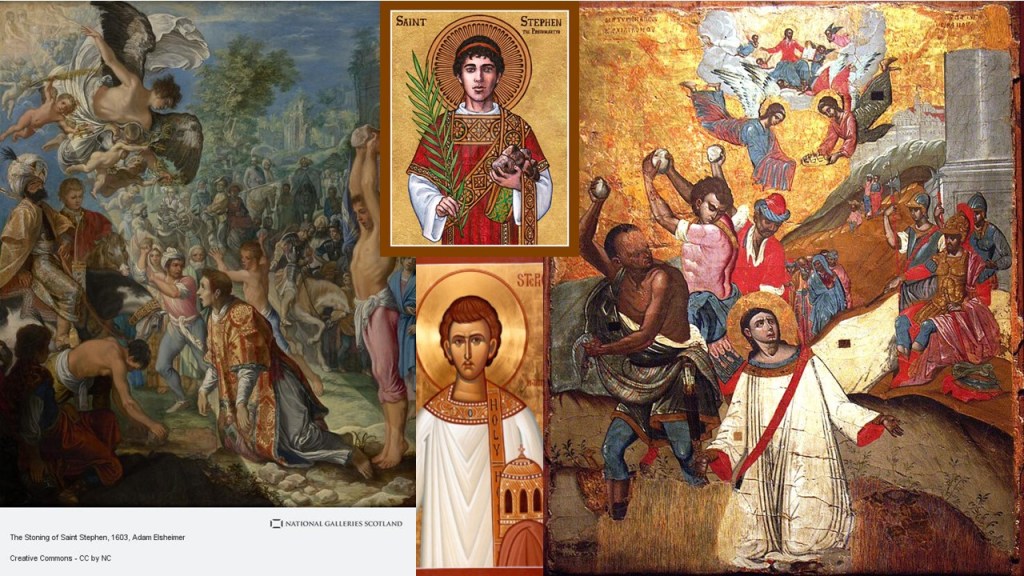 Maybe it is the reticence of the Bible after the death of Christ that we don’t hear either the substance of the ‘great wonders and signs among the people’ (Acts, 6, 8) that he perpetrated other than talk big to people with whom he disagreed. Even these disputants had to resort to lying to make Stephen look like a significant threat: “they secretly instigated men, who said, “We have heard him speak blasphemous words against Moses and God, ” and lots of other unlikely fictions (Acts 6, 11f.). And thence to the nub of the story. Men surround Stephen (in a circle perhaps) once they have thrust him out of the city and stone him, wondering why, perhaps, as they do so, he seems to think and declare they are doing him a favour and leading him all the quicker to the glory of Paradise. Saul, a Jewish functionary then but later to become Saint Paul, was present at Stephen’s stoning.