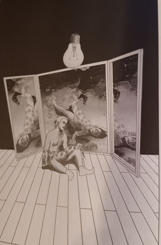 Anne Wroe in her contribution to OE says that O’s quest is fulfilled in ways that other contributors to the volume make us doubt. She says the E represents a lost wisdom that matters because, like any kind of tree (she is a dryad remember) she was rooted and once pulled out of the ground by O she is still rooted, but now singly in Death alone, and the wisdom that things pass.[18] She is, in her own words the knowledge that ‘the wreck already had roots’.[19] The book ends with O still alive watering a tree in memory f E in its text, but in its graphics it ends with E’s dead body tripled in the triptych artwork in his dark cellar studio which formed his portal to the Underworld as the picture of a wreck. He sits in front of these reproductions of her with only the dress she is wearing in his pictures next to his flesh (though he wears socks). His flesh though beyond the sock tops is drawn with more solidity than at any other point in the book (see below).