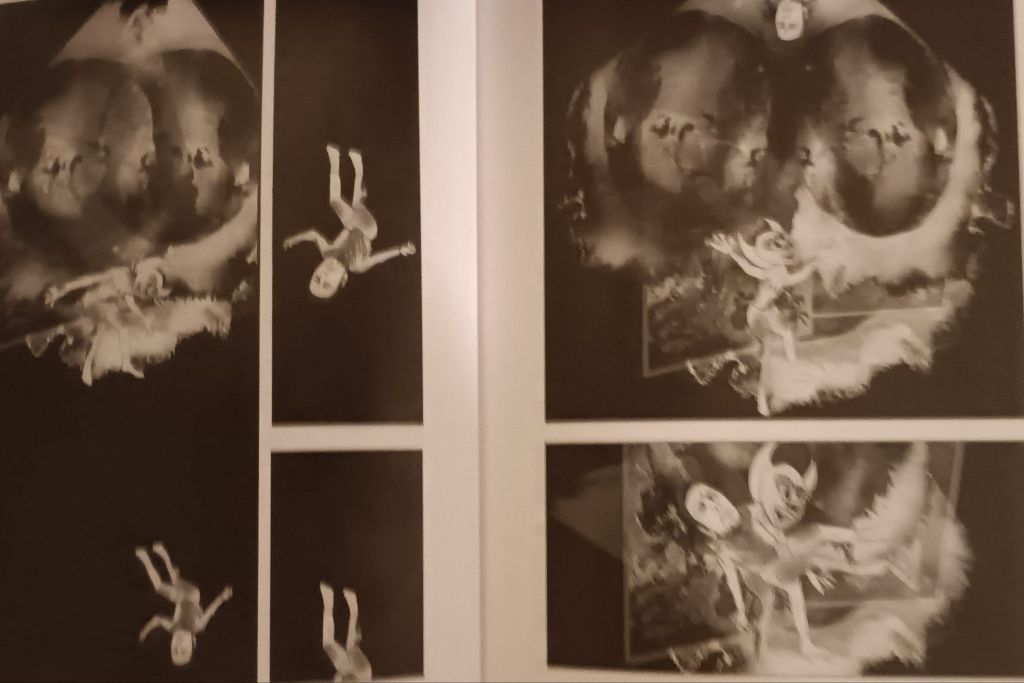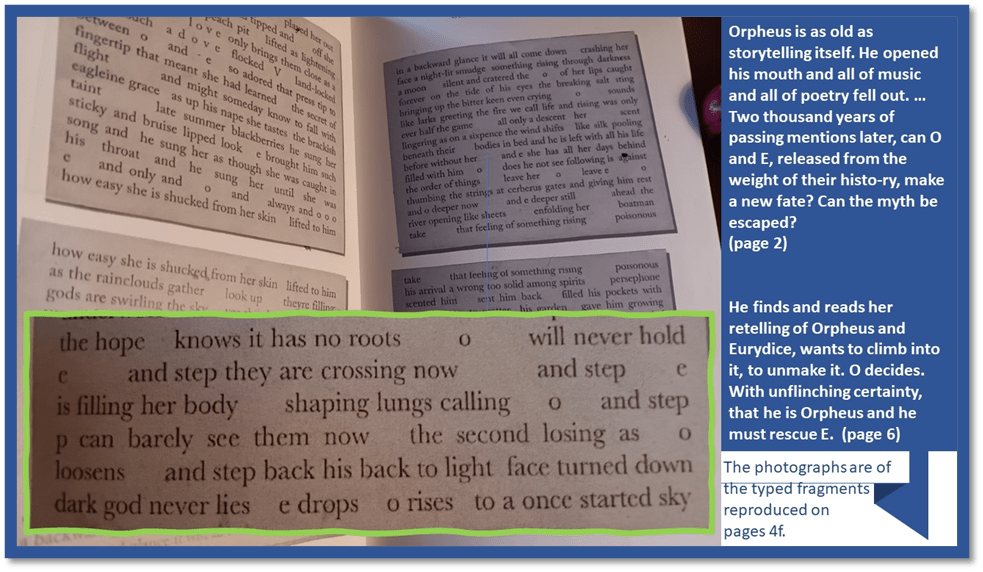I have already indicated above how O uses his ‘O-shaped’ hole, from which projects his commandeering voice, to fragment and silence Kiran and E as much as attempt to collaborate with her. His story (or ‘hist-ory) keeps taking over, with his artistic and other preoccupations to the foreground. Indeed it is not easy to locate E’s textual or graphic contributions. These are in the form of hand-written lyrics on paper that are photographed such as the beautiful and paradoxical recall of the Styx (the river and Goddess of Oblivion in the Greek Underworld): ‘all of us drinking / to forget – ‘.[12] The story otherwise by her I believe is told on photographic reproductions of fragments of typed text that appears from page 3 to 5 inclusive may be imagined to be her original ‘retelling’ which O aims to rescue, which tells of a secreted bond between p and o (Pluto and Orpheus) as he disobeys Pluto’s one command (deliberately perhaps in order to lose E again and raise his own stock as sole lone ranger of the masculine-only virtues he thinks he represents: