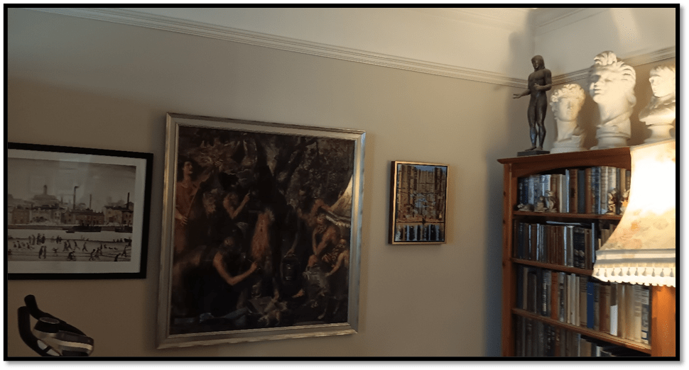Our living room. The sculptural pieces are reproductions of an attendant ritual kouros, Apollo bust, a satyr (reproduction from the BM – is it Marsyas?) and John Milton bathed in lamplight.