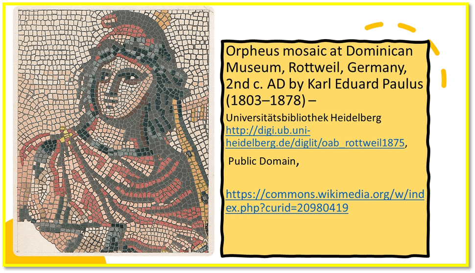 That man is guarded on that krater from petition from a man with a scythe in his hand. He will continue to assume his right of special treatment and power up to the time of the Roman Empire and beyond when that Empire transformed to a Christian Holy Roman Empire in the Byzantine East (speaking Greek mainly) on the one hand and fragmentation in the West on the other hand as a result of being under the attack of Northern European and Slavic forces. We see him in splendour in a mosaic from Germany below too from the a picture in mosaic from the second century AD. It is a lovely mosaic wherein Orpheus engages his audience with his adorable eyes rather than by just his music alone.