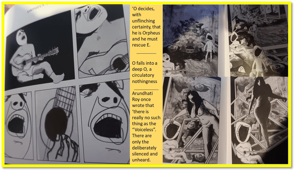 Once you have Orpheus in your life, he keeps on making ghostly appearances, the validity of which is sometimes questionable. Recently, I found references to him in Rapture’s Road, a new volume of poems by Seán Hewitt and compared him as a cultural icon to the life and lyric autobiography of Lou Reed ( connect to those blogs at the links on their names). And debating his presence is where I intend to start here before I look at the way in which a work describing itself as A Graphic-Poetic Exploration makes part of his story problematic in that it is not JUST his story but that of an active force in life, art and other narratives, Eurydice (or E) who, as Sarvat Hasain says has before being given only the role of she who ‘waits outside her story’, totally passive to Orpheus’ (or O’s) actions.[2]