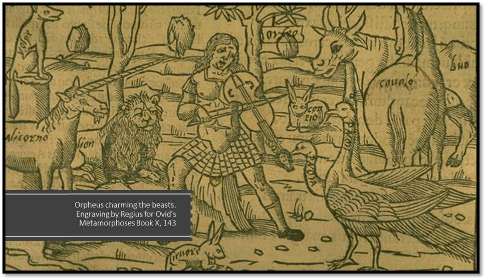 Sometimes O becomes the O of his mouth which is also the hole in his guitar, the twentieth century substitute for a lyre as the lira da braccio for the Orpheus of the Renaissance, of which Titian may have painted one. E, who is also at one allegorical layer, Kiran enacting Eurydice is crushed by the voice of the lover attempting to ‘rescue’ her as patriarchally en-scripted males are wont to do until, feeding the hole as she goes by, she passes away from it unseen, for the mouth has covered O’s eyes and ears totally. As for silencing, this feeds off the traditions of Orpheus as a man who makes all species lose their nature as we and they know it and enact an order of his making, Such as Ovid painted him in words for Augustan Rome. Later medieval and post-medieval illustrators merely made a contemporary avatar of that man who stopped everything but the need to listen to him, and him alone.