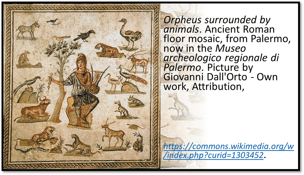 Such myths had use for Romans, in Ovid’s time, a supposed golden age restored as Augustus wanted his subjects to believe and to the Roman colonists later, say of Sicily, where the mosaic below, showing a similar and more convincingly stopped scene, except that Orpheus here seems more pragmatic, ensuring peace amongst the warring by controlling the space between them.