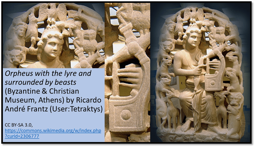 For the Eastern Roman Christian Empire and its church of patriarchs, this image of Orpheus as a man who embodies love and authority that speaks through his voice and divine instrument, as Christ needed the divine instrument of the Byzantine Church and State, could make Orpheus into an avatar of Christ, but one instinct not only with love but a love that is powerful and enforces the pax Romana in the Christian Empire (an enforcement more bloody and conflicted than the word ‘pax’ suggests to most of us. This Orpheus as an allegory of Christ, needed as the Empire veered between commitment to Christianity or regression to apostasy that the bishops faced daily, using ‘pagan’ tools to figure out their own version of Christ, they cemented a socio-political version of Orpheus as strong as that of Augustan Rome.