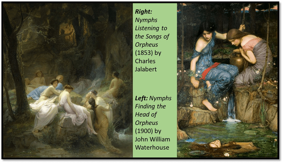 In England, bohemians of the later century had caught up, though the naiads are considerably more fleshly than Jalabert’s in John William Waterhouse’s Nymphs Finding the Head of Orpheus. They are still rendered as listeners primarily for the find the head because, even severed from the manly body it once occupied, it still sings, like a severed mouth (or ‘O’) than a whole head. And in both cases the hero is not depicted or seen for it is the ‘male gaze’ itself, seeking satisfaction from the drawn flesh of women reduced to passive acceptance of its power. However, this may reflect the nature of these particular artists passive to the zeitgeist that was then culturally hegemonic. In painters of greater substance, the gaze the sexual-political zeitgeist, even when present, is interactive between male and female, even at the level of looking at a picture, as in Gustave Moreau’s Thracian Girl Carrying the Head of Orpheus on his Lyre (1865) – see below. It is the woman who bears the burden of the tradition here and, as far as xenophobic Ancient Greeks were concerned, a barbarian woman – a Thracian, a woman from the land of Orpheus’ purported birth.