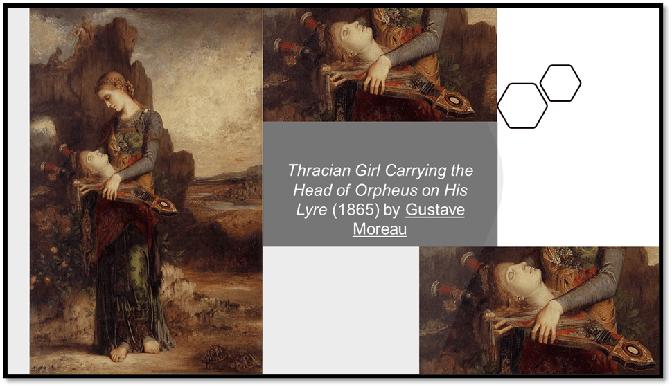 Thus far we can see why this necessary – but why do this in terms of the story of Eurydice, which plays only a small and late part (in its development of the myth. Thus far the association of Orpheus in the nineteenth and twentieth century with nationalist and imperialist aspiration in the picture story I have briefly indicated would illustrate the fact that myths of greatness arising from the mass of common men to validate an ideology of patriarchal rule is already illustrated. However the quotation from Pablo de Orellano I gave above, does not stop where I stopped it. He goes on to say of ‘the problematic assumptions behind the story of the common man becoming a romantic hero’ that: the result in OE is ‘nothing short of a philosophical slap in the face of gendered identities’.[7] This takes us back in history I think to the historical reception of the mythologies of Orpheus again through the ‘multiplicity of variants bleeding into one another’, for each version signals ‘a further shedding and rend in past certainties’, in Stephen C. Kenyon-Owen’s words.[8]