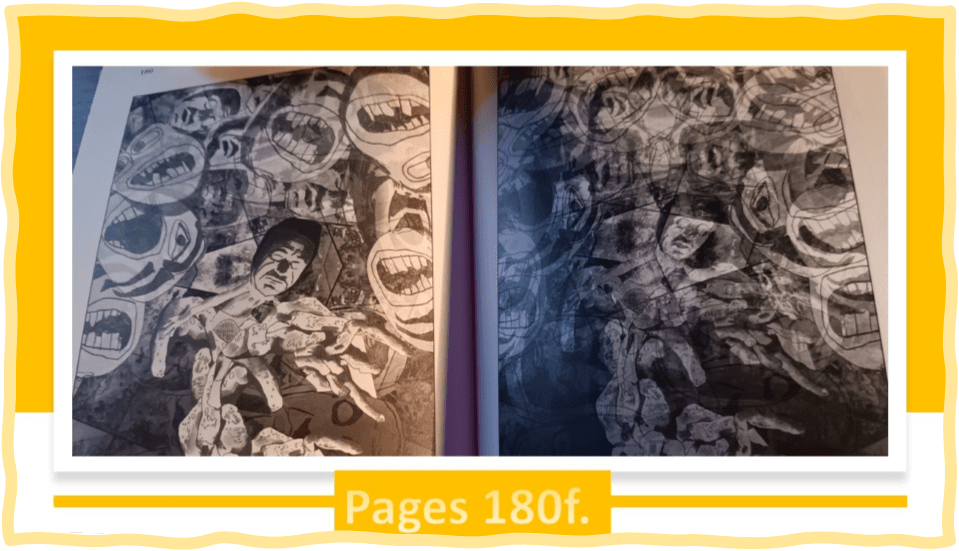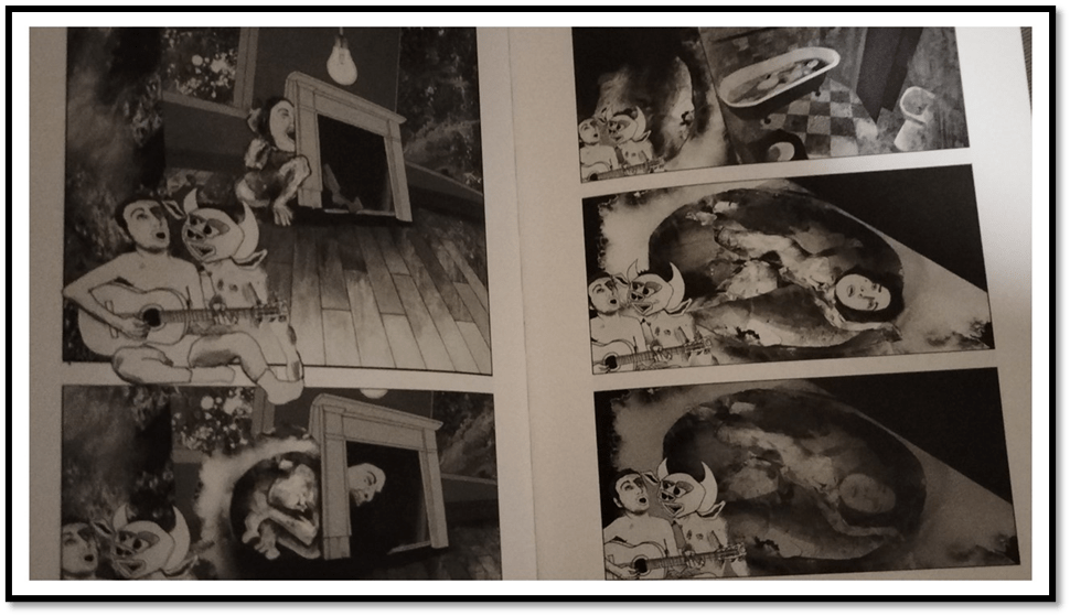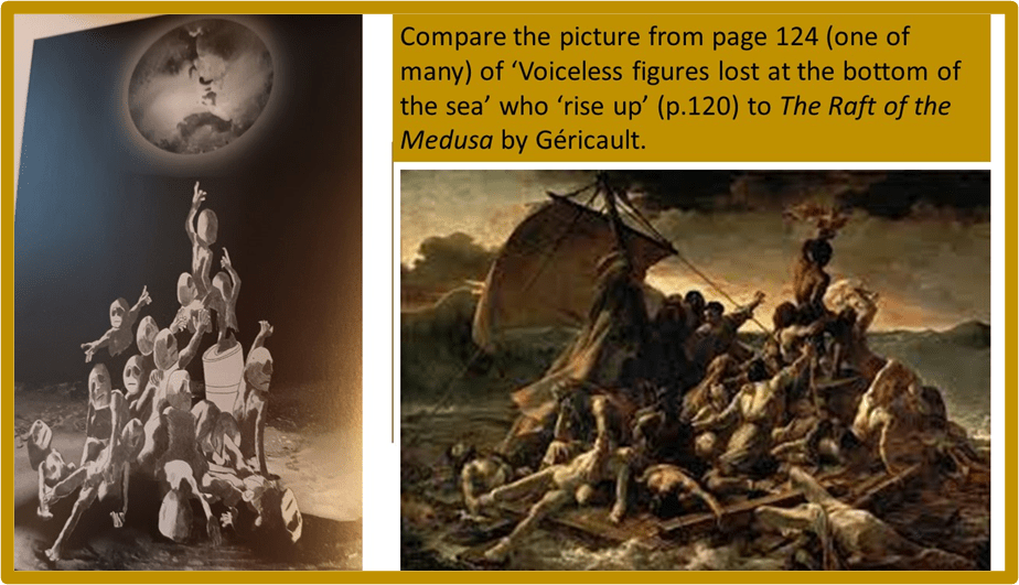 O has many models but all are of the romantic hero and often the Romantic poet-hero. He is Dante visiting the Inferno with Virgil, a source for the Orpheus stories after all, but in the form of his own body double with the head of Picasso’s cartoon versions of the Minotaur monster or Beast (in which Picasso himself showed up his own sexually predatory nature). He recalls even the bulb from Guernica in some frames of the story (see below for instance). He is Milton’s Satan with a crew of rebel angels falling and Faust with Mephistopheles (again the Minotaur) and prefigures his book The Wreck by being the entire cast of males on the painting (but not in reality – there were women there that Géricault removed) in The Raft of The Medusa (see my blog on this at this link).
