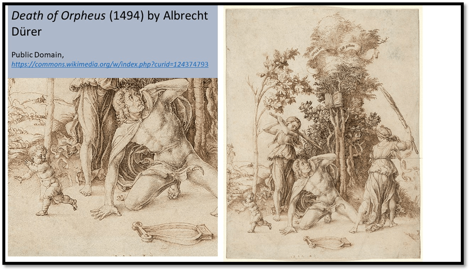 Albrecht Durer in a 1494 drawing rather obscenely queers the idea by having the women less Bacchic than angry at a man, who having forsaken women after the death of Eurydice and turned to ‘pederasty’ (see the young child fleeing him as the Thracian women beat him. The legend on the tree is in described below (source at link):