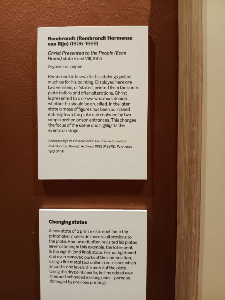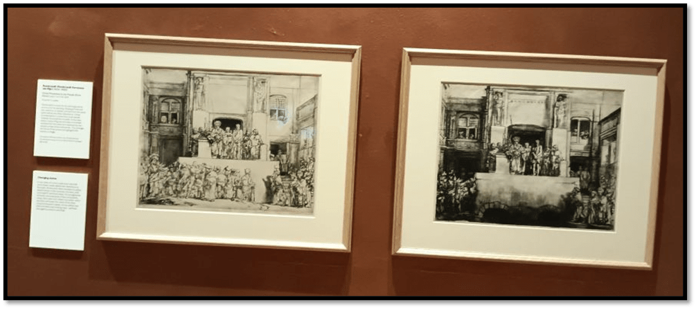 But a comparison of what I saw and did not see is a limiting way of indicating the variety of the exhibition itself, which I yet need to indicate and example in this introduction. The variety is not explicable by the method of printing or variety of methods, for many of the greatest examples (those from Rembrandt, for instance) are hybrid forms. The use of Rembrandt tells us something of the limits of the curatorial approach. The two versions of one print Christ presented to the People (Ecce Homo), which is not the example in the catalogue, below are ostensibly given to show how a great artist might exploit the fact that when printing blocks became over-used, they had to be recut. Rembrandt varied the treatment here immensely. The curator’s hence made the ‘changing states‘ in a particular print’ s career its main focus.