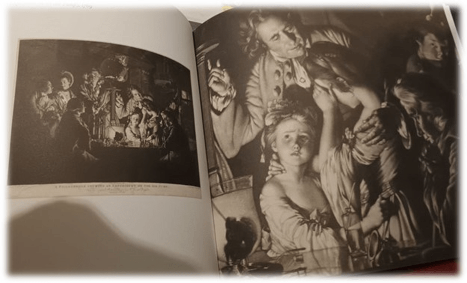 But after my last blog, I found myself (after reading this catalogue) retreating a bit from making that distinction between invention and creativity I pedalled there, for creativity in printing often goes hand in hand with the invention, adaptation or hybridization of processes in novel ways, such as mezzotint. Mezzotint, the catalogue shows refined on the creative effects of tonality, texture and volume that chiaroscuro effects in woodcut developed less fully. That isn’t the best example of this trend, for, in the catalogue, mezzotint examples tend to ‘improve, on chiaroscuro mainly for the purposes of realism of representation, especially the illusion of the volume of human flesh in social quantities rather for more deeply creative reasons. See for instance the opening of the book illustrating depth and volume effects using mezzotint reproduced in part below (pages 50-51). It shows Valentine Green’s’ reproduction of the imagery of human congregation found in The Air Pump, a painting by Joseph Wright of Derby. I did not see this print in the exhibition, but I don’t miss having done so particularly, impressive as it is.