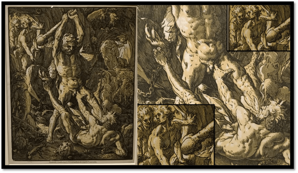 That I did not see the original of this print pains me a little. But that feeling is not uncomplicated for I saw some works that aren’t in the catalogue, such as this by Hendrick Geltzius’s fun work: a fine sixteenth century chiaroscuro woodcut, purportedly showing the conflict of Hercules and Cacus, a scene from The Aeneid, and, as the explanatory plaque says, ‘the triumph of Good over Evil’. But there seems also much in the creative finesse of the printing that creatively queer that contest, as Cacus, spreads has legs for the downward arrival of the hero’s huge club. In the background detail, there is much homoerotic suggestion. How to read all this? I do not know! However, it surely has to be more creatively and richly read than the plaque does, which emphasises mainly ‘dramatic three-dimensional effect’.