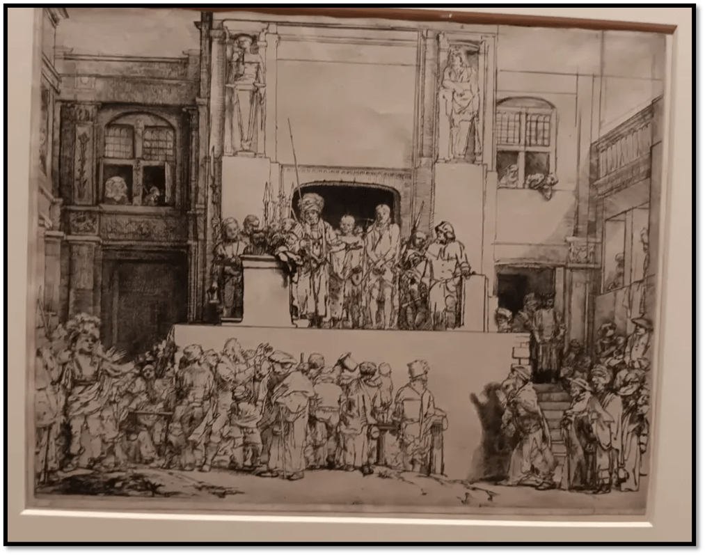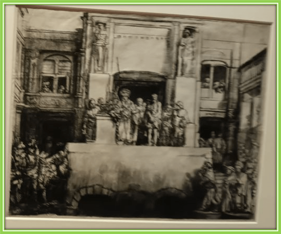 In contrast in the second drawing, the auditorium has been cleared except for small groups at the stage sides. The blank wall of the front of the stage-like structure attracts our gaze largely because of its bold use of blanks and dark shadows (even the pentimento ghosts of the changed printing matrix). Personally. I think the inference is that it is the viewers of the work (us, as it were) now who, in part, form the ‘people’, to whom Christ is presented. It is this group that hence must take responsibility for disowning the Messiah, always a message of the Counter Reformation Church (though Rembrandt far from identified with that Church). Moreover, though architectural detail remains the scene is given over to tonal chiaroscuro effects, that predict the conflict of emotion of the scene itself, including the dark guilt of human responsibility for Christ’s denial and the being-given-up to Crucifixion. These decisions are not only cognitive and affective but also both genuine and holistic creative choices. They are not just playing with prods to inventive (or re-inventive) ingenuity given by the very range of print methodologies continually opening up to artists in the seventeenth century Holland.