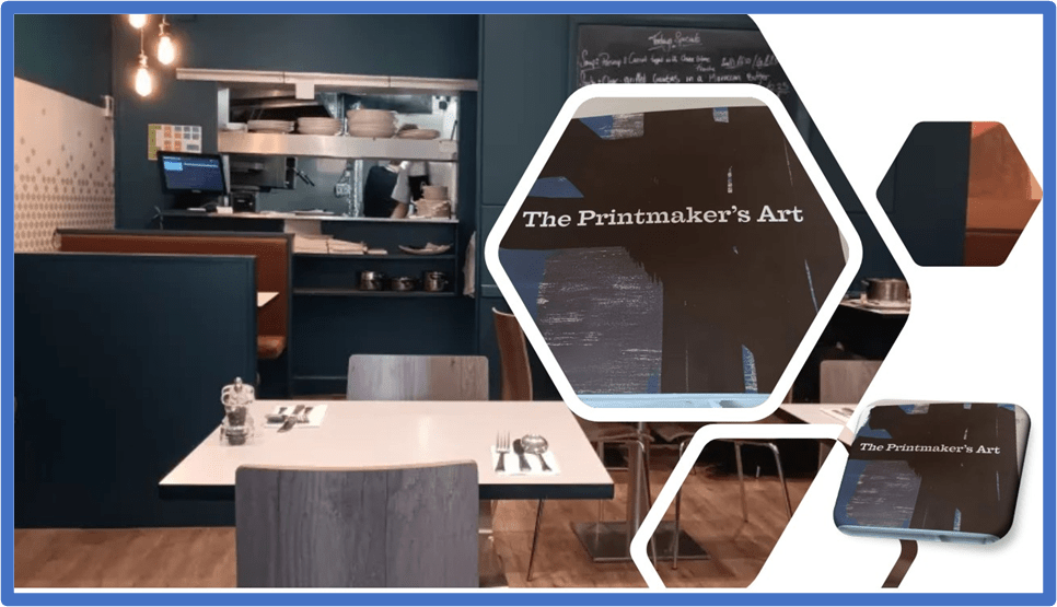 However, let me introduce The Printmaker’s Art exhibition and its great catalogue which I read over lunch at The Mussel Inn on Rose Street over a dish of gambas in Moroccan butter sauce. As I expected, the catalogue, which has some works that varied from the actual exhibition, tended to focus on the invention of varied techniques of printing rather than the creative contribution of the art. Here it is on the table of The Mussel Inn.