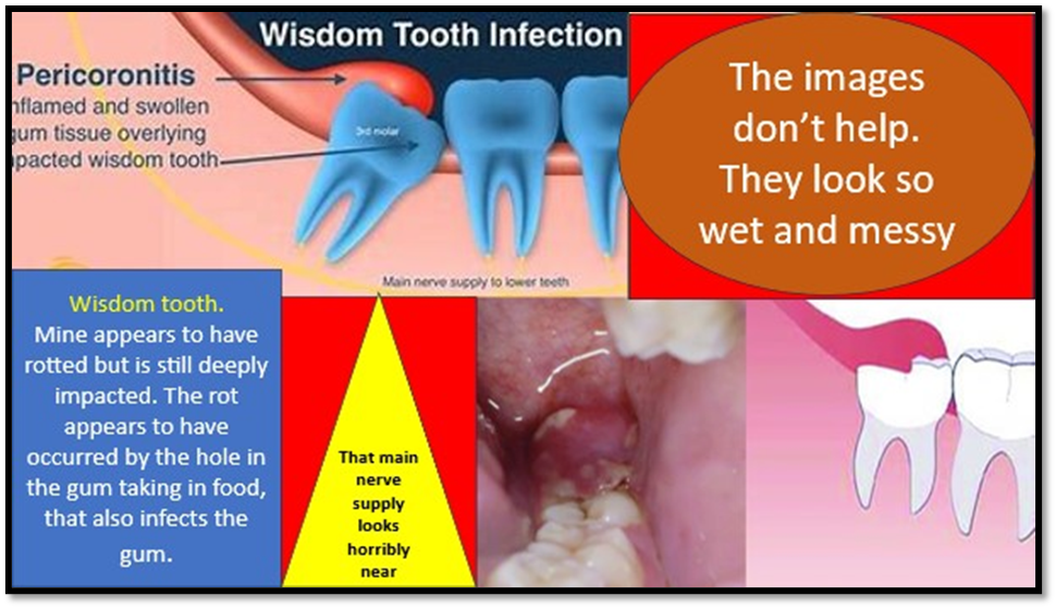 NNow, I am in a pub in Brampton, taking my first antibiotic with a slimline tonic before going to Carlisle. I read the instructions the surgeon gave me, which said that, in some cases, lower wisdom teeth extraction leaves you with pain or numbness permanently because of nerve damage. Here’s hoping not. Pain is coming on now, so it’s onto the Co-Codamol and hope that it passes in three days as is usual.