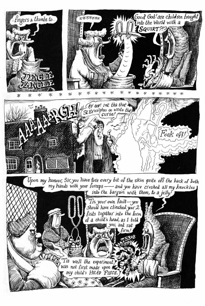 It gets nowhere that fabulous sentence and leaves everything still open, resisting closure in every sense and way it can. Even the reader’s response is, at best, a guess of what is ‘likely’ not what will be. And the tale goes on blaming Mum and Dad. Just like in Larkin’s most famous poem, Sterne, posing as Shandy, goes on to show how how your parents have already ‘fucked you up’ (in both senses of that F word) before you started by a description of their amazingly funny generative copulation that led to our ‘hero’, as in Martin Rowson’s graphic version below: