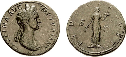 Pompeia Plotina coin, celebrating Fides on the reverse. By Classical Numismatic Group, Inc. http://www.cngcoins.com, CC BY-SA 3.0, https://commons.wikimedia.org/w/index.php?curid=5696753