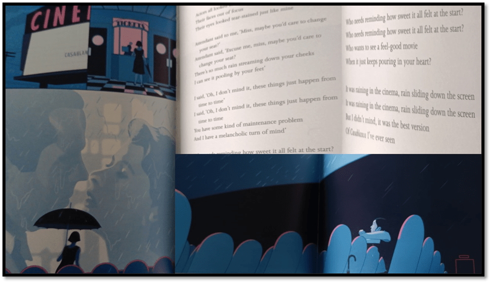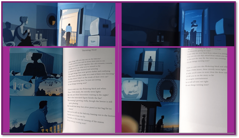 Both artists produce complentary art to each other with numerous variations in the art’s power of additional suggestiveness. I am trying as I write to recall which lyric I think works best with the graphic art illustrations. I selected first the lyric Turning Noir, which deliberately uses the ambivalence of films of the 1940s to test whether an ‘old romantic comedy’ watched on TV might hide murdered bodies in the trunk of a couple’s ‘own car’. This might be film noir (a good Barbara Stanwick femme fatale film perhaps), or it might be Now, Voyager since both types of narrative experience are evoked. The story gets lost in the gaps between different interpretations of what is happening in the story. The woman’s awareness of the tensions in the film sort of get carried into the hopes, expectations and fears she feels about thecrelationship with her nale lover across the gap between them as she watches the film with one eye and the moody lover beginning to look estranged from her as he stands on the balcony of their blue-shaded hotel room: ‘I wonder, is this the turning of the season / or are things turning noir’.[7]